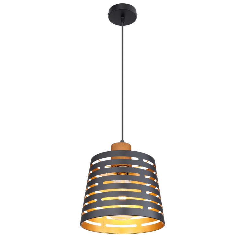pendant lamp metal black matt, wood natural color, metal black matt, gold colors, cable PVC black, ø: 250mm, H: 1200mm, excl. 1x E27 60W 230V