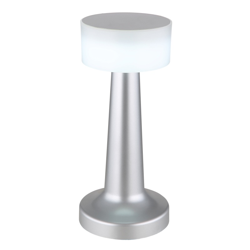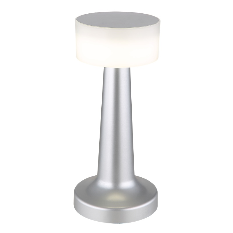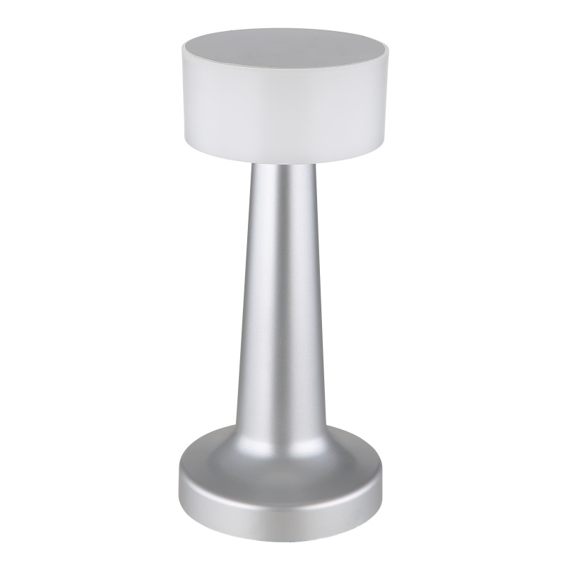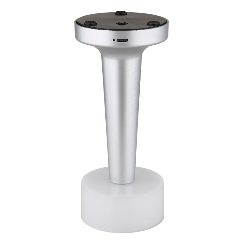 table lamp plastic nickel matt, plastic opal, pressure switch, Touch On/Off, Dimmable, Continuous Touch Dimmer, Color fixing, USB-A 2.0 – USB-C, Accu CR18650 800mAh 3.7V, ø:95mm H:215mm, incl LED 1W 230V, 100lm Source, 55lm Output, CCT2700/6500/4000K