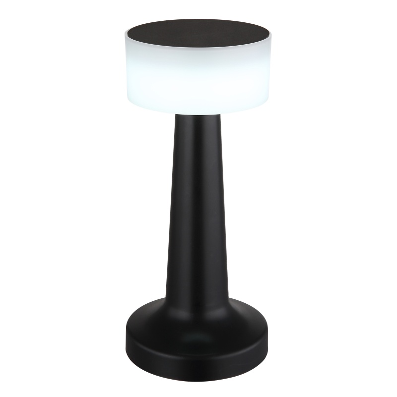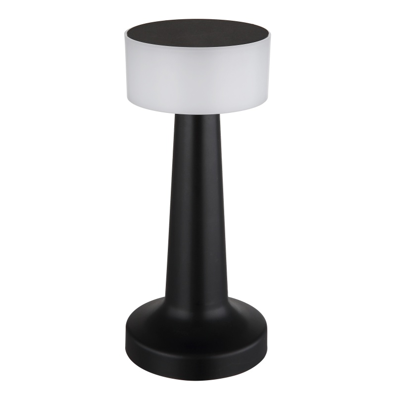 table lamp plastic black matt, plastic opal, pressure switch, Touch On/Off, Dimmable, Continuous Touch Dimmer, Color fixing, USB-A 2.0 – USB-C, Accu CR18650 800mAh 3.7V, ø:95mm H:215mm, incl LED 1W 230V, 100lm Source, 55lm Output, CCT 2700/6500/4000K