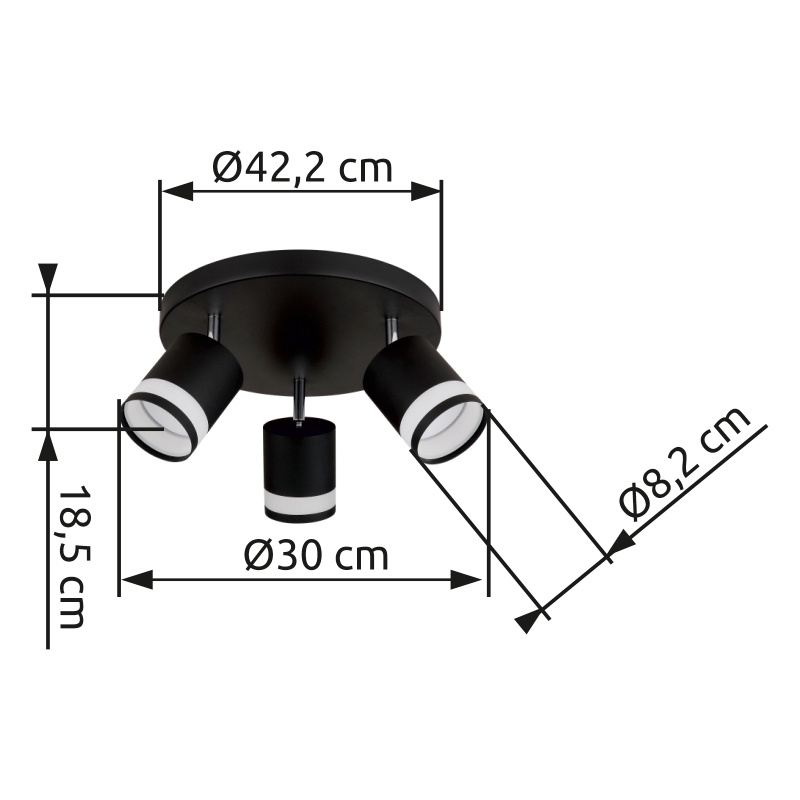 prožektorid metall must matt, metall must matt, plastik valge, ø: 300mm, H: 185mm, sh 3x GX53 LED 7W 230V, 600lm allikas, 364lm väljund, 3000K, tindikaup. LED pirn 10161