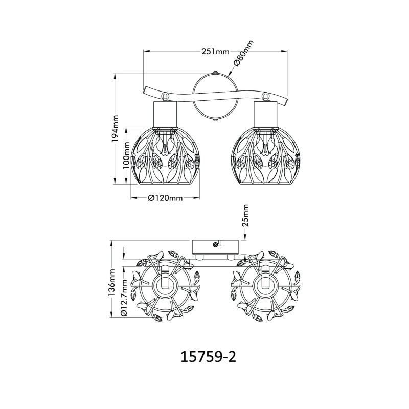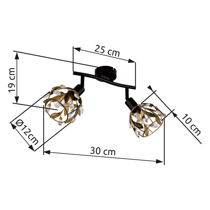 prožektorid metall must matt, metall kuldsed värvid, must patineeritud, akrüül kristallselge, PxLxK: 250x120x155mm, v.a 2x E14 25W 230V
