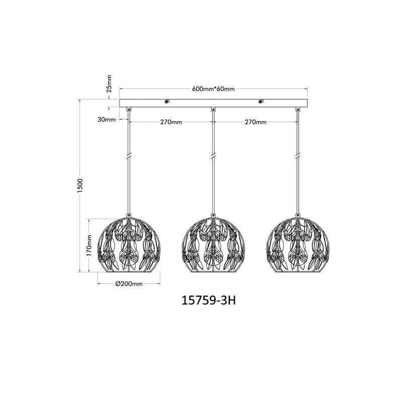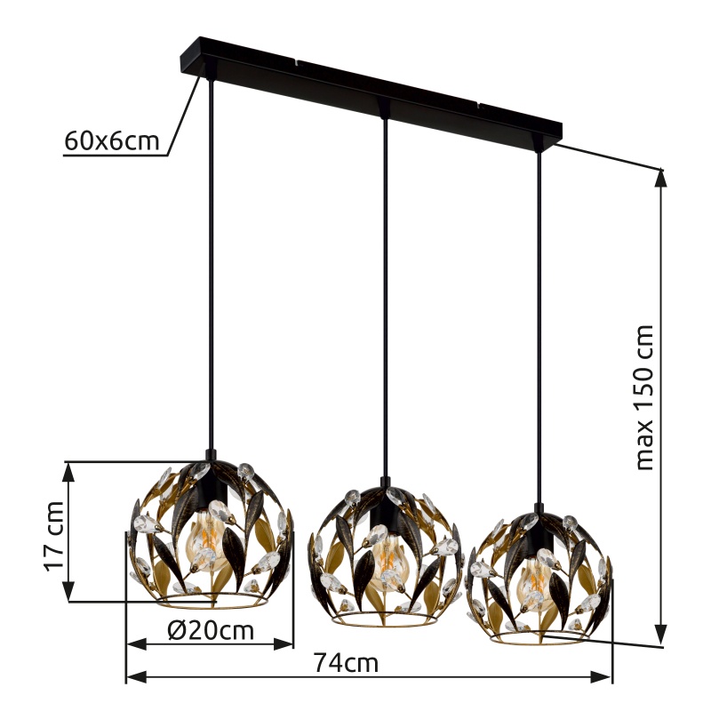 laelamp metall must matt, metall kuldsed värvid, must patineeritud, akrüül kristallselge, kaabel PVC must, PxLxK: 740x200x1500mm, v.a 3x E27 40W 230V