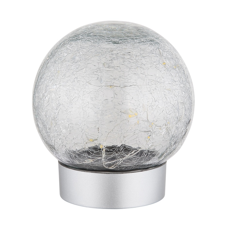 laualamp plastik hõbedane värv matt, klaaskuul selge pragunemine, kaabel PVC must, liuglüliti, v.a adapter, USB-A 2.0 - USB-C, akuga kaasas 14500 600mAh 3.7V, IP44, ø: 120mm, H: 135mm, Kaabli pikkus 800mm, sh LED 0.06W 230V, 3000K