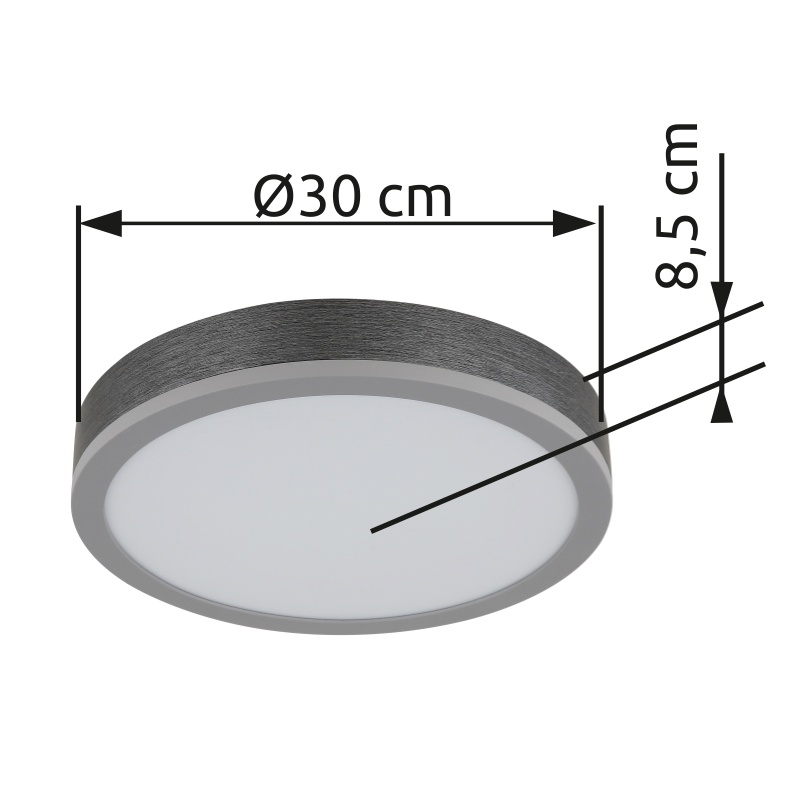 laevalgusti alumiinium hõbedane värv, MDF hall tume, plastik valge, ø: 300mm, H: 85mm, sh LED 12W 230V, 1250lm Allikas, 600lm väljund, 3000K