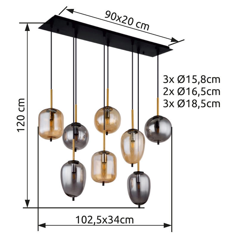 pendant lamp metal black matt, brass matt, glass smoke colored, amber, cable PVC black, LxWxH: 1025x340x1200mm, excl. 8x E14 40W 230V