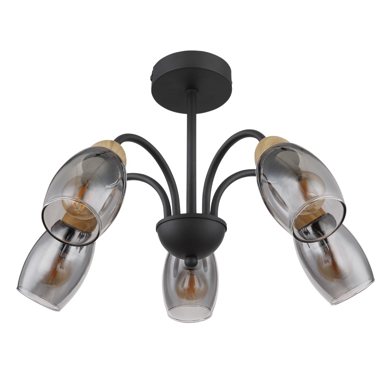 ceiling light metal black matt, glass smoke colored, metal wood look dark, ø: 470mm, H: 290mm, excl. 5x E14 25W 230V