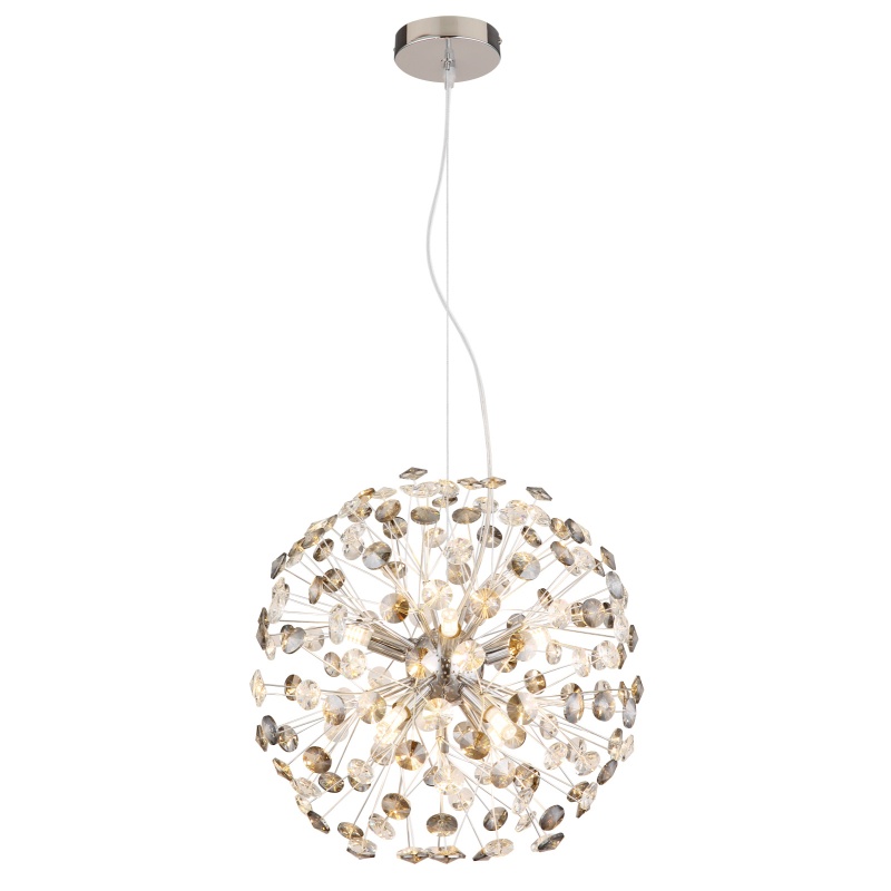 lühter metallist kroomitud, K9 kristallid suitsuvärvi, läbipaistev, kaabel PVC läbipaistev, Kõrgus vähendatav, ø: 400mm, H: 1500mm, sh 8x G9 LED 3.5W 230V, 350lm Allikas, 350lm Väljund, 3000K, tindi. LED pirn 10676