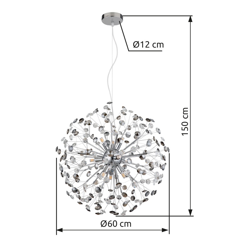 lühter metallist kroomitud, K9 kristallid suitsuvärviga, läbipaistev, kaabel PVC läbipaistev, Kõrgus vähendatav, ø: 600mm, H: 1500mm, sh 9x G9 LED 3.5W 230V, 350lm Allikas, 350lm Väljund, 3000K, tink. LED pirn 10676
