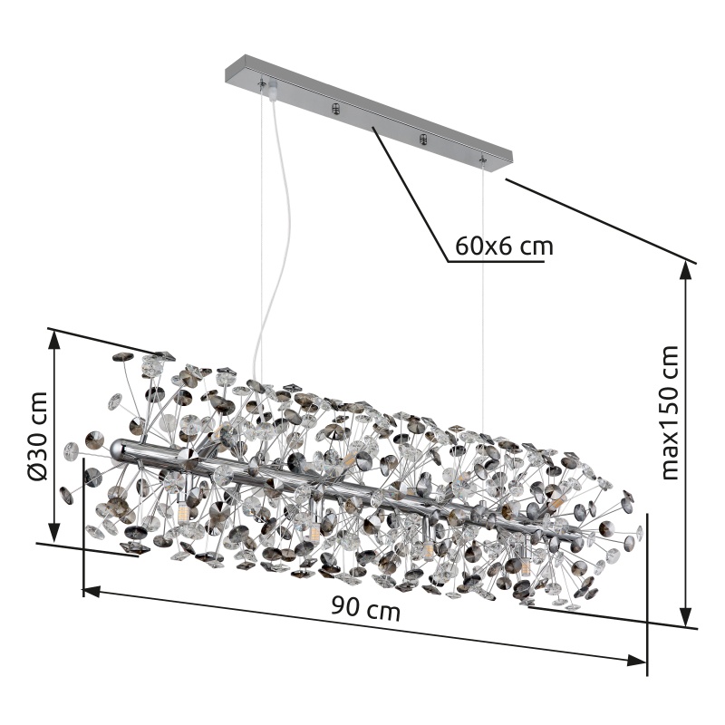 lühter metallist kroomitud, K9 kristallid suitsuvärvi, läbipaistev, kaabel PVC läbipaistev, Kõrgus vähendatav, PxLxK: 900x300x1500mm, sh 12x G9 LED 3.5W 230V, 350lm allikas, 350lm väljund, 3000K, ink. LED pirn 10676
